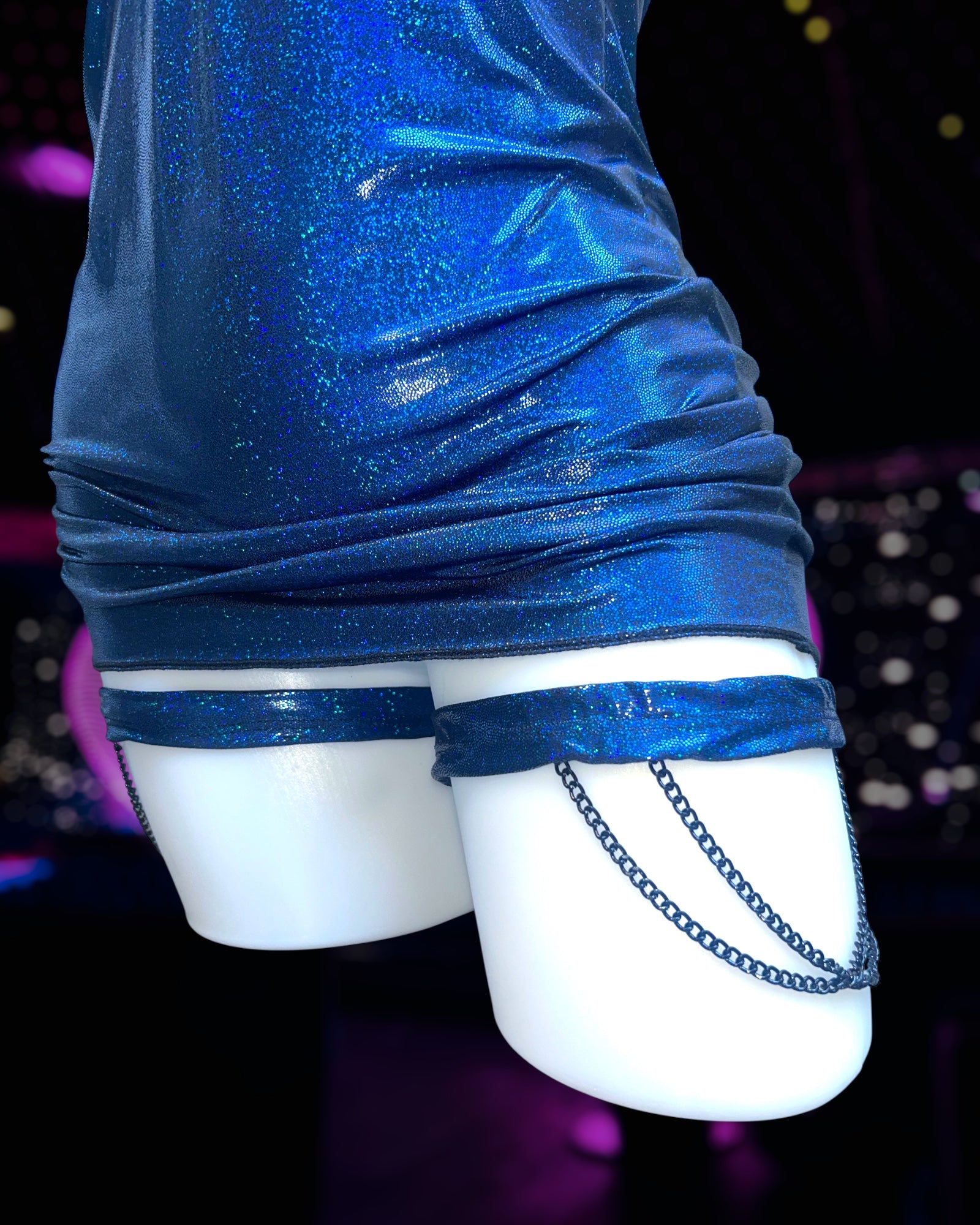 Bleu nuit holographique et chaînes noires qui captent la lumière — un bijou de peau pensé pour briller quand les lumières s’éteignent.💙🖤