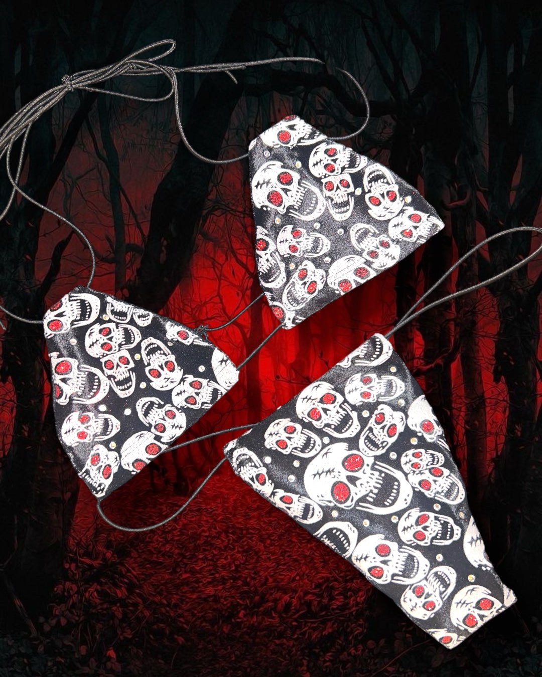 Micro bikini Skully — en tissu noir pailleté à motif tête de mort, sublimé de strass posés à la main. ☠️🩸